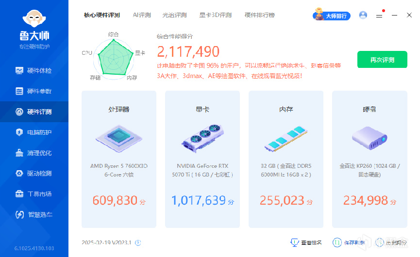 搭配5070 Ti的CPU爲AMD 7600 X3D,與7800X3D同款96MB大三緩。