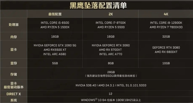 不過要想享受《黑鷹墜落》的極致畫質,玩家需要滿足硬件門檻需求:官方推薦 4K 分辨率需 RTX 3080 顯卡,並建議安裝在固態硬盤中: