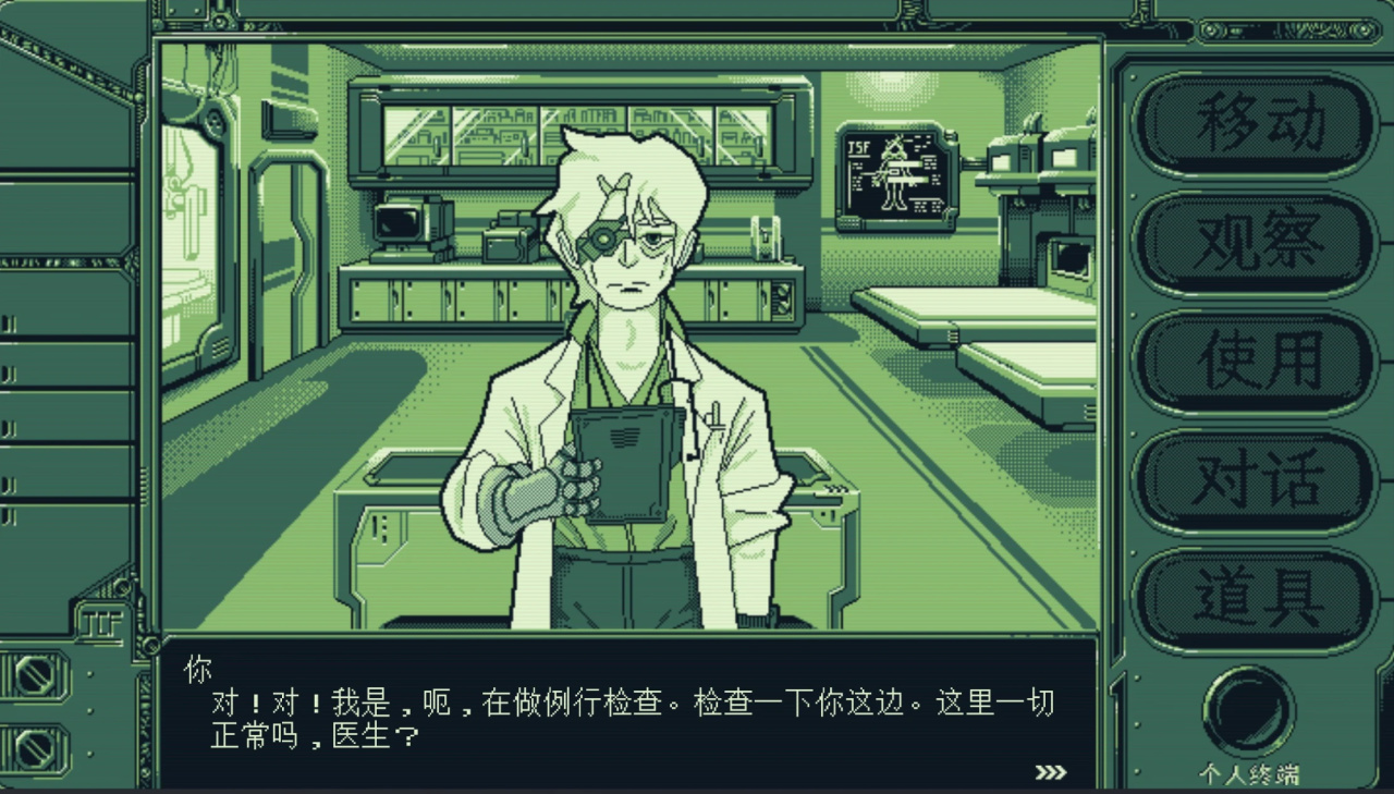 另一位船员,舰船上的医生,他是一位恪尽职守,但脑筋死板的角色,平时你与他说话时,他总是一板一眼,丝毫不懂变通。作为舰船上唯一的医生,他严格地记录着每个人的病情,并提供最正规的医疗方案。