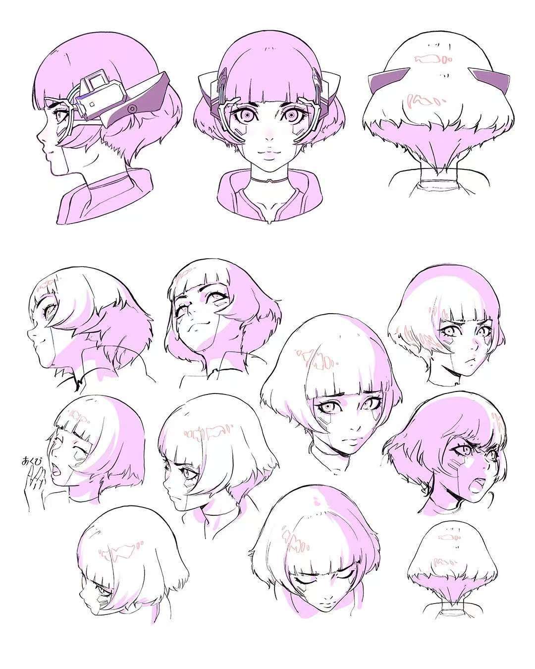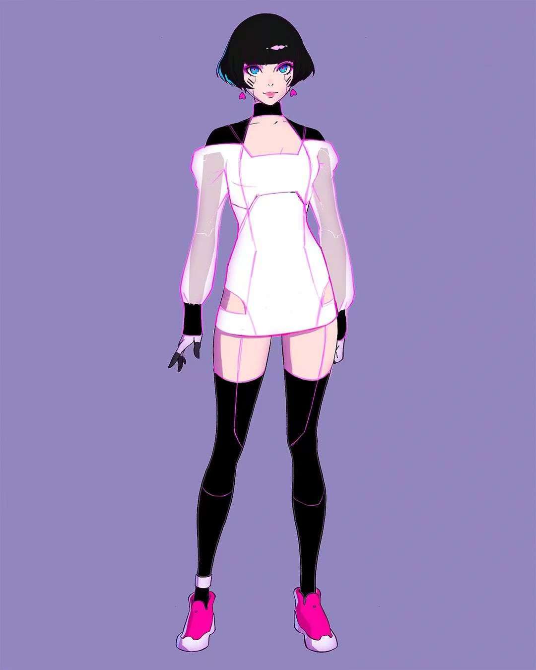 She wore a sleek, form-fitting sleeveless bodysuit with a v-shaped neckline trimmed in cerise which leaves her thighs outside, on which a single bright pink holster and a band fit snugly. She paired this with a cropped, high-collared baby pink jacket with sleeves ending above her elbows, decorated by subtle, white color accents. For footwear she wore a pair of bright pink sneakers as well as a white band around her left ankle. Her hands were white with black fingers, with her interface plug located in her left hand.