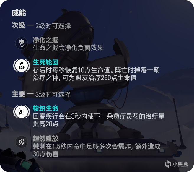 主要威能:梭織生命加點花男抬血功能,不算很多。超然盛放需要連續命中二十多發,才能觸發,而且也只有30傷害,還不如一個近戰,太少了。