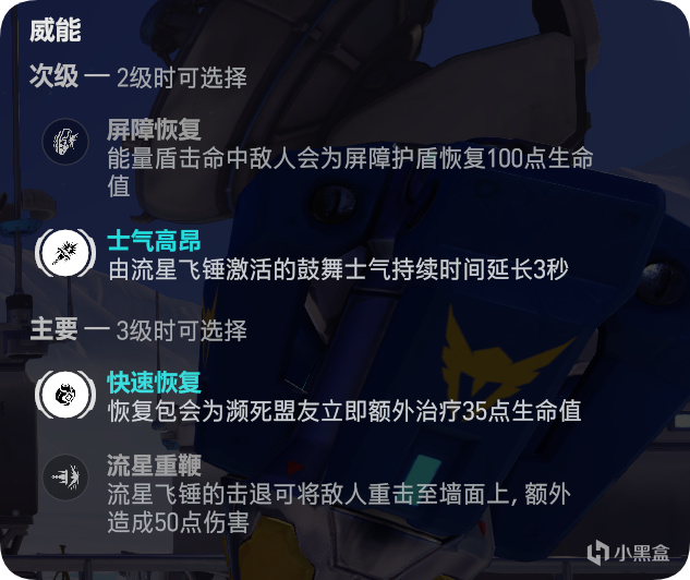 次級威能:當前版本小錘的被動治療已削到4秒,在標準的溫斯頓長短陣容中,除了猩猩狗位,小錘是有點偏向掛機的,有時觸發不了被動隊伍血線就一直抬不起來。如果點了士氣高昂,把飛過來的猩猩敲走獲得7秒的被動治療,還是不錯的。
