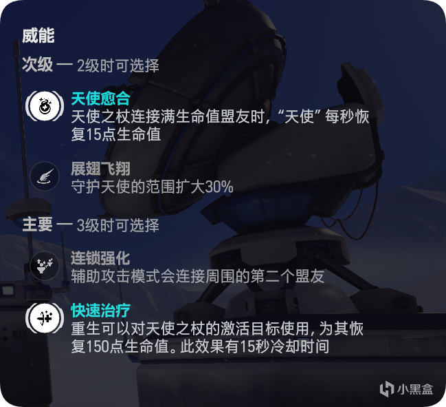 次要威能:天使癒合15/秒,天使自身的治療量爲55/秒。而天使有個被動是天使會治療自己40%的治療量,考慮到減療,自回覆量在11.25-22之間飄。但是這個自保情況比較極端:就是隊友滿血,然後你在被人打,這種可能比較適合新手局容易喫傷害,而隊友也不會管你死活那種,保一點下限。