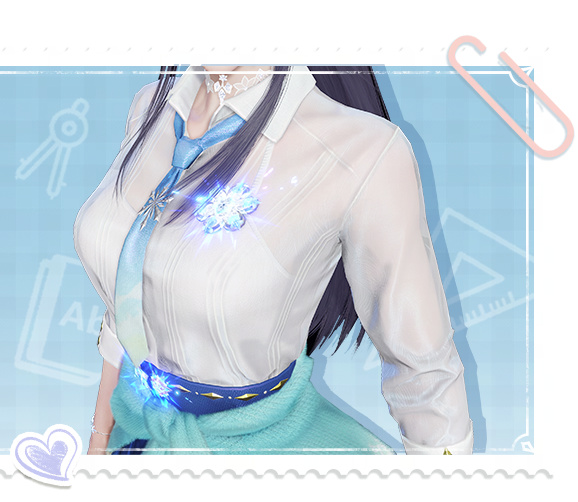 半透長袖襯衫勾勒出御姐般的完美身線,胸前別掛着雪花樣式的徽章,脖頸處的蕾絲Choker和藍色領帶都藏着學姐的搭配巧思。