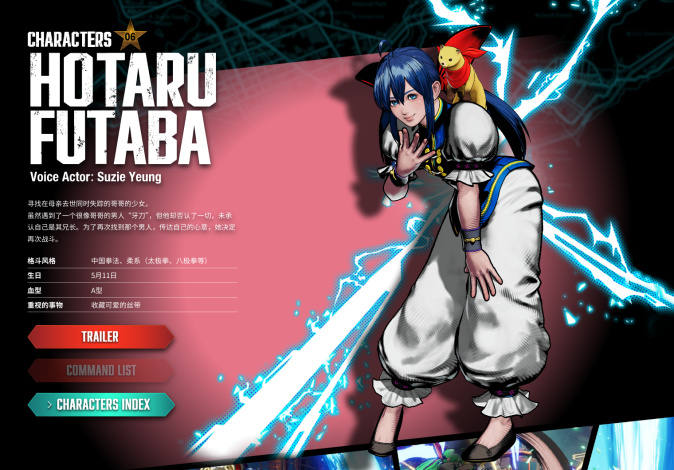《饿狼传说》经典的角色之一,特色为使用的中国拳法柔系以及其肩上那只失踪哥哥饲养的貂!