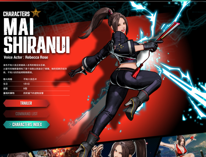 开放的人物列表里面首当其“冲”的肯定是我究极喜欢的人物角色【不知火舞】了,相信不少玩家哪怕你没有玩过SNK旗下的任何一款游戏也或多或少的听过,毕竟这位不单是SNK的灵魂角色也同样是.......咳咳,只可意会不可言传了这一波