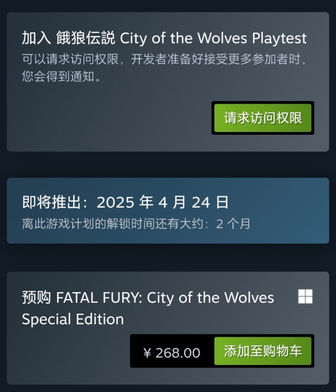 玩家们仅需要前往Steam平台然后搜索游戏《饿狼传说:群狼之城》然后选择请求访问权限即可加入本次游玩测试。