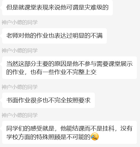 自稱與神戶小德同院的同學莫莫和天天告訴我,他們不清楚神戶小德和校方具體的糾葛,但從他們對神戶小德的評價來看,後者在同學間的風評並不好。