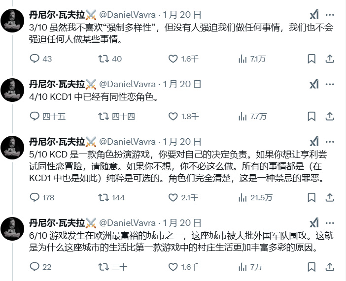 最近大火的《天國:拯救2》就遇到了這種情況,遊戲發售前被人指出有“無法跳過的同性劇情”“突出的黑人角色和關於女權主義的講座”,給人一種DEI元素強行拉滿的悲觀,爲此開發商Warhorse的創始人丹尼爾.瓦夫拉連發了十條推文,澄清這些爆料純屬謠傳,適量的DEI內容也絕不會影響遊戲流程。