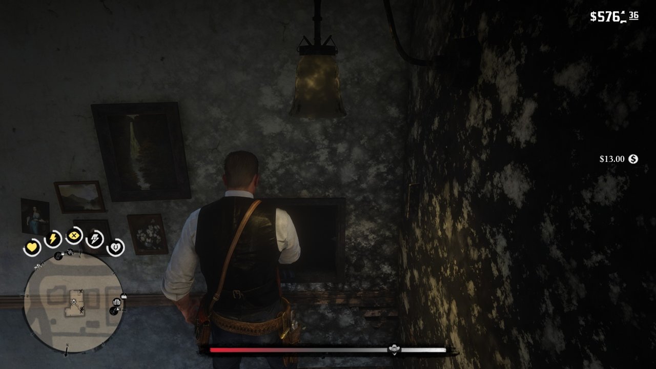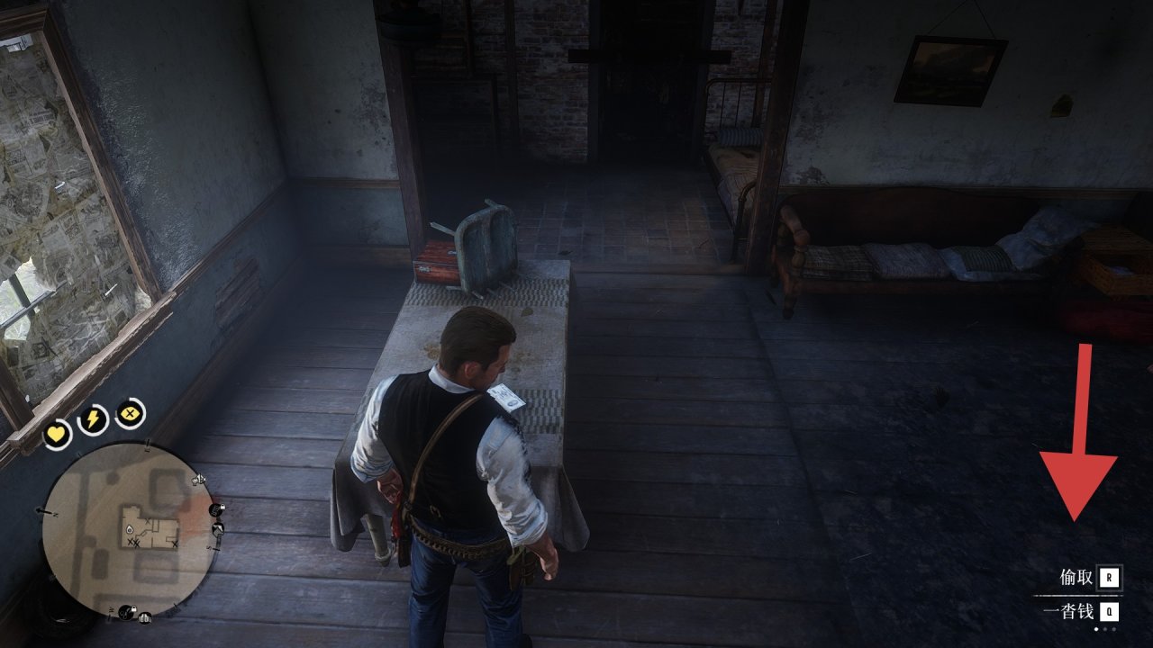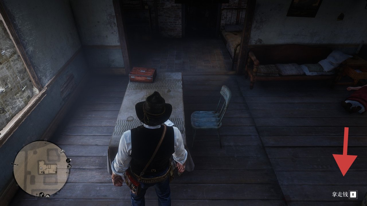 12.给自己打一个疗伤药,接着点燃炸药,然后马上走到桌子去拿钱。亚瑟在做出拿钱动作后,炸药爆炸会中断这个动作。此时桌子上的钱会变成“一沓钱”,就说明成功了。