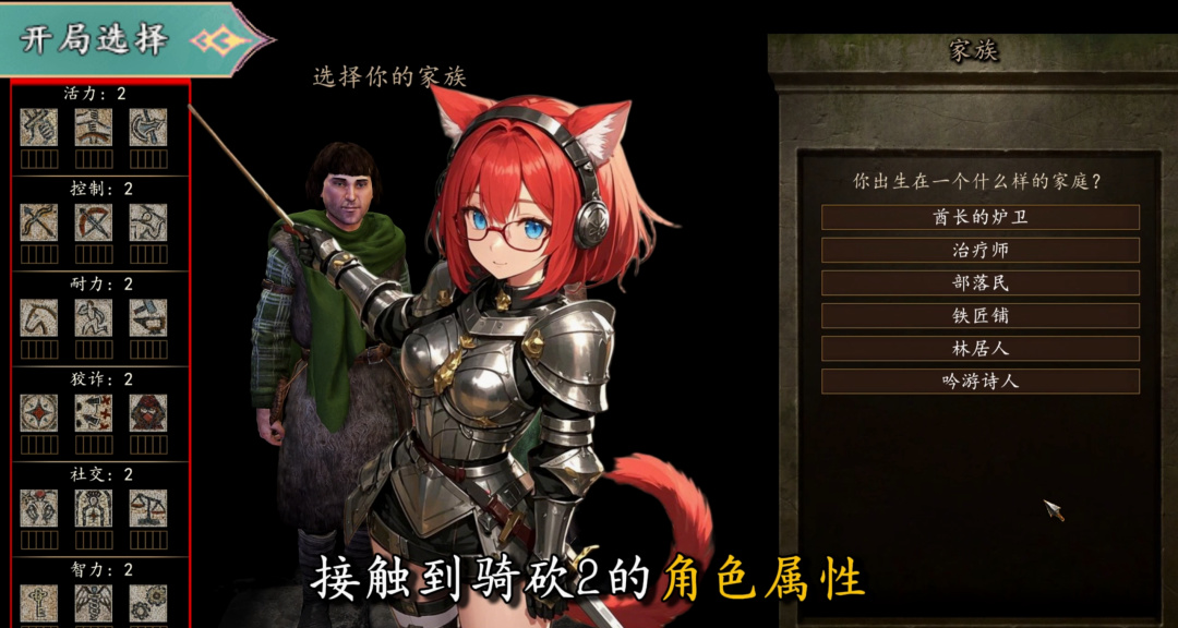 接下來我們在主角的背景設定中,會首次接觸到騎砍2的角色屬性;“活力”對應近戰技能,控制對應遠程技能,耐力對應騎術、跑動和鍛造。其中“鍛造”的技能詞條和通過鐵匠鋪帶來的收益是比較大的,所以新手建議關注一下“耐力”技能。