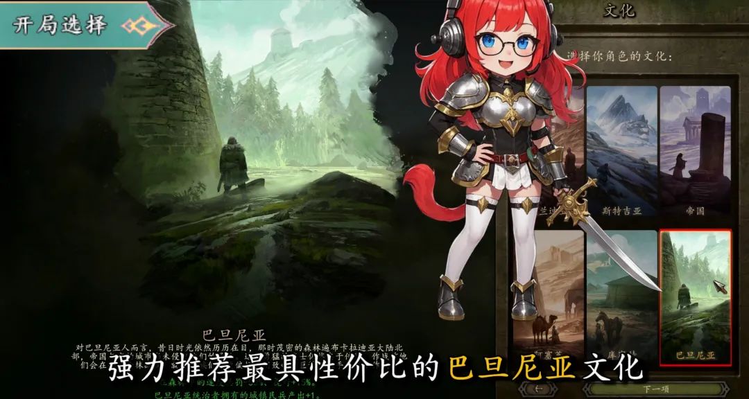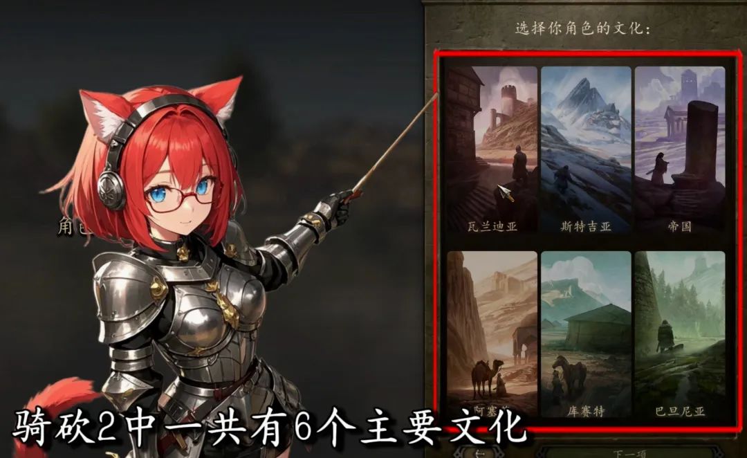之後會進入角色文化選擇界面,騎砍2中一共有6個主要文化,我們可以在對應的文化介紹中瞭解背景設定;關於文化的選擇主要是決定了我們獲得的BUFF和DEBUFF,這些BUFF是永久性的,後期在不作弊的情況下無法更改。