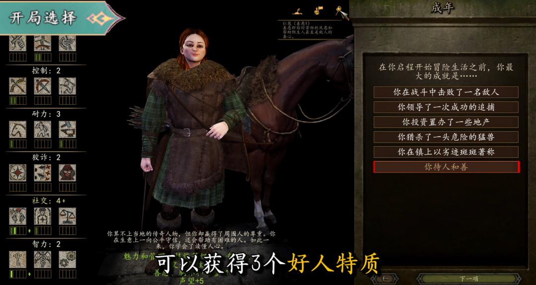 而在第五頁開始,我們的選擇就會影響到主角的“特質”了,雖然目前“特質”的影響並不大,不過這裏還是強烈建議選擇“你待人和善”,可以獲得三個好人特質。