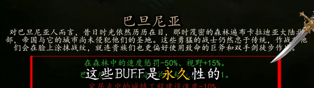 所以這裏只需要重點關注這些BUFF和DEBUFF的具體效果,新手玩家尤其要需要重點關注減輕速度懲罰的效果;所以強烈推薦選擇巴旦尼亞文化,主詞條不僅可以降低50%的森林速度懲罰,還可以增加15%視野(僅限森林)。這是遊戲中大家公認的最實用的BUFF沒有之一,因爲卡拉迪亞大陸森林地形非常多,每個國家都有森林地形;而移速相關BUFF不僅可以大幅減少跑圖時間,還能更容易追上敵方部隊,不論前期還是後期都是剛需。