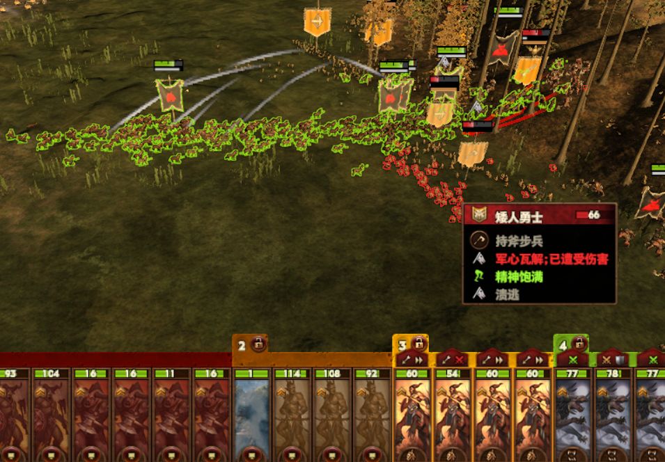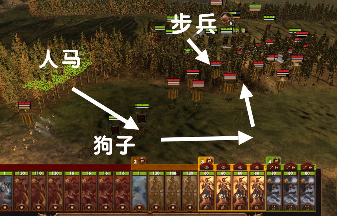 注意,「矮勇」是重甲步兵,人马和狗子是冲不动矮勇的,不过也没啥损伤,只要别陷进去。