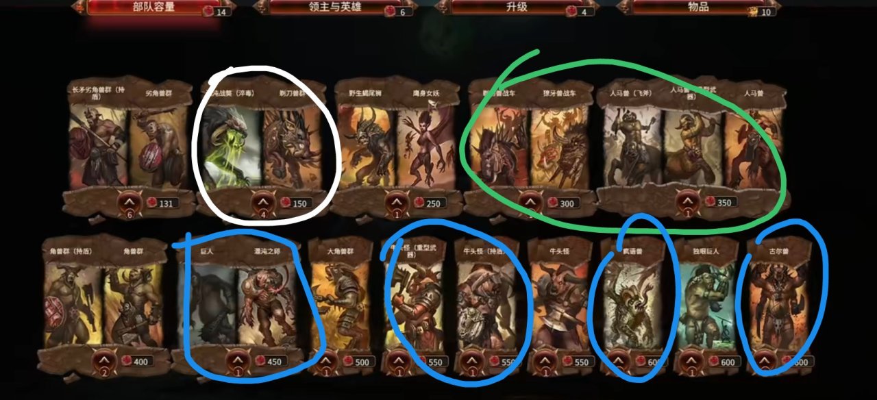 野兽人这个派系普通步兵、射手什么的只是开局和前期需要用,后面基本就要被淘汰掉,特别是步兵。主要的输出单位还是怪步+骑兵+巨兽。