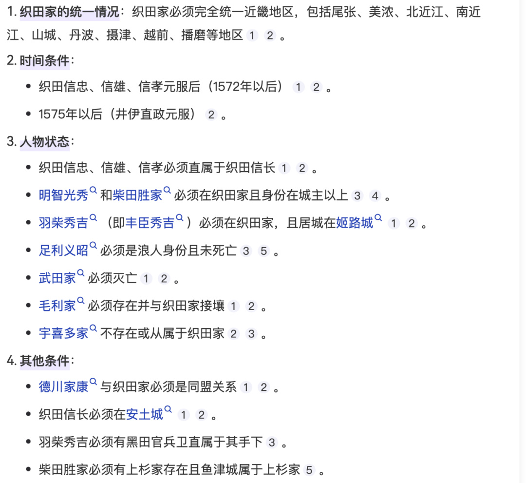 先看遊戲中的表現——在光榮作品《信長之野望》以及《太閣立志傳》中,想要觸發本能寺之變劇情,大體需要滿足下列複雜條件:(歷史和地理雙盲者可以直接跳過圖片)