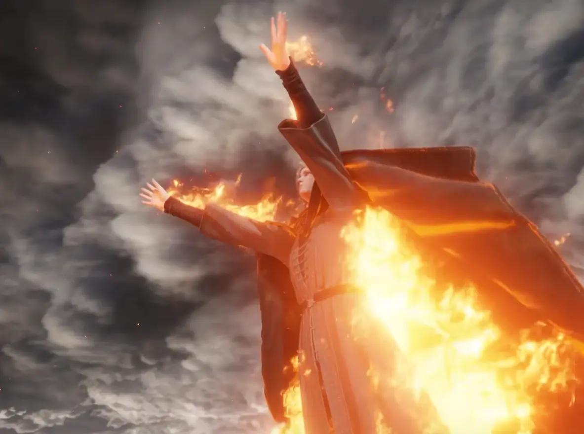 梅琳娜毫無保留地輔佐玩家,幫助玩家成爲艾爾登之王,即便明知要將在火焰大鍋中再次犧牲自己,徹底死去。