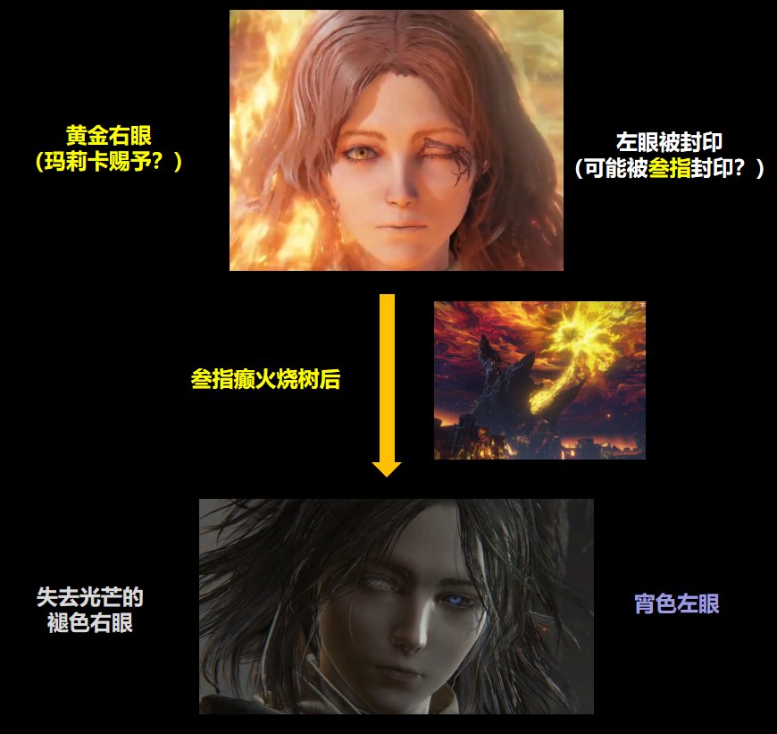 當玩家用癲火毀掉黃金樹後,梅琳娜的右眼眸呈現褪黃的灰色,左眼眸解除了封印並睜開,呈現宵色。