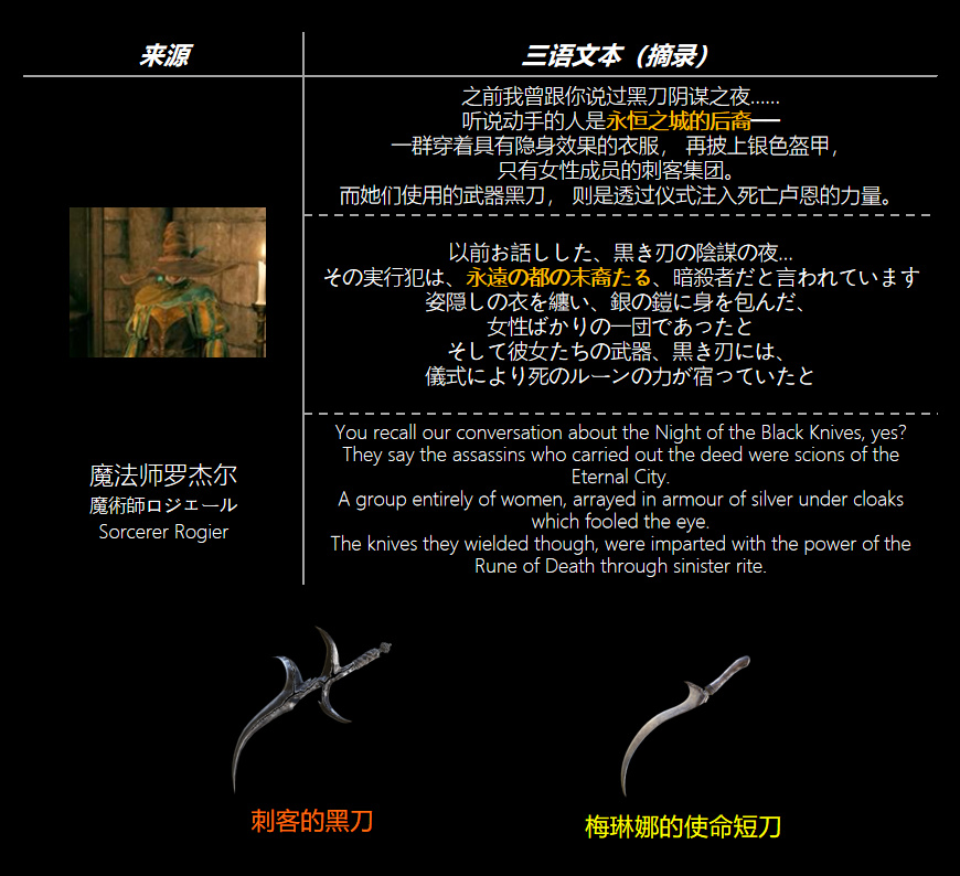 黑刀是永恆之城後裔這點在羅傑爾口述中出現。但問題是,我們知道稀人的真正起源是巫者村,她們又和永恆之城有什麼關係?而其中的梅琳娜,又爲什麼會有黑刀的戰鬥技藝?