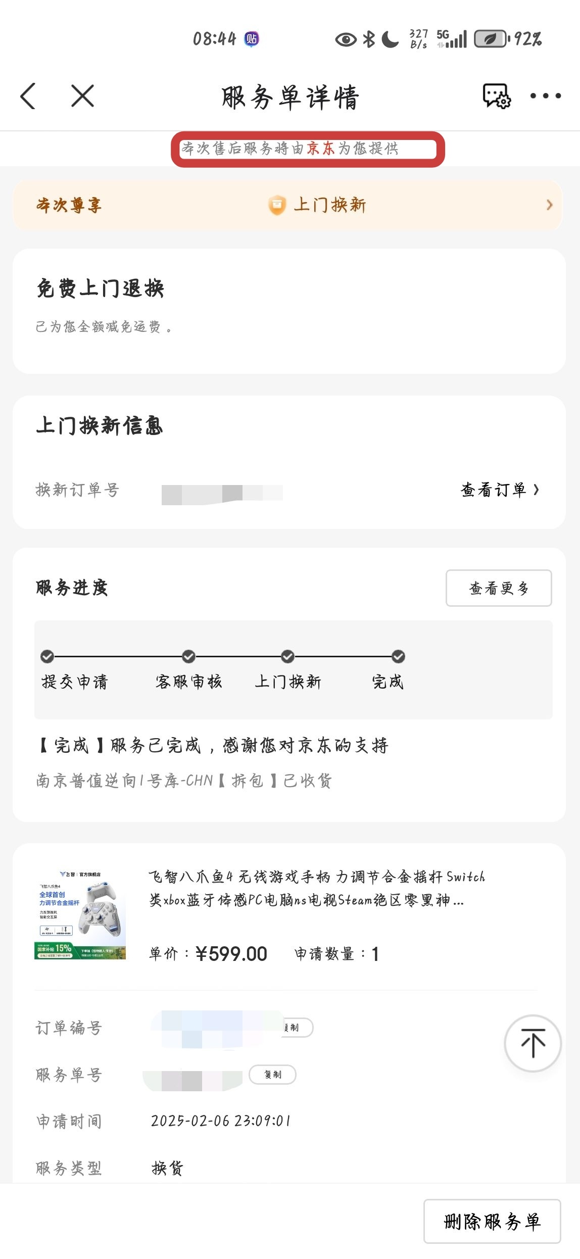 出了點問題以後申請售後維修,晚上23點申請的訂單,第二天早上接到京東客服電話說可以直接上門換新問我是否同意,我確定以後直接生成了換新的新訂單,下午快遞員就帶着新手柄上門把舊的取走了,整個流程突出一個迅速和省心,這個時候才能體會到爲什麼說京東售後好。