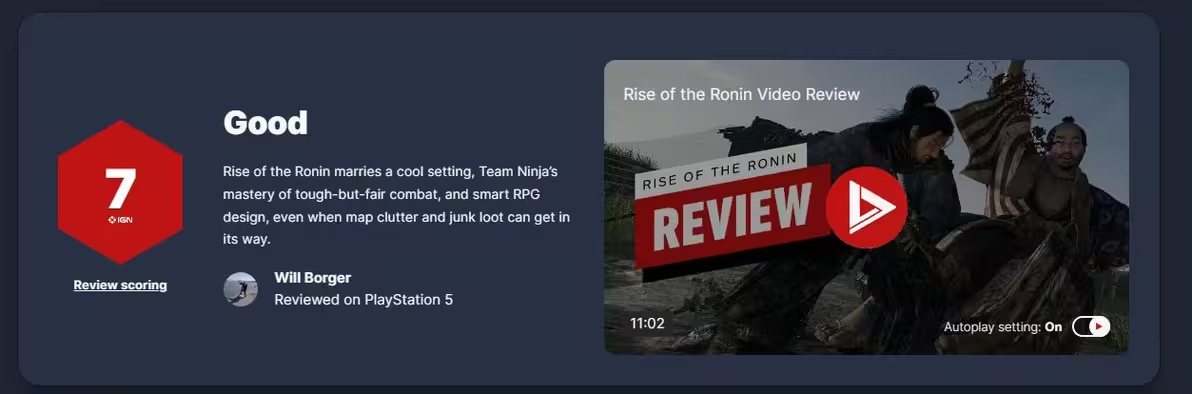尽管《浪人崛起》在MetaCritic的媒体均分仅78分,被批评“画面表现落后于次世代标准”“开放世界设计平庸”,但其在玩家端却收获了非常高的评价。