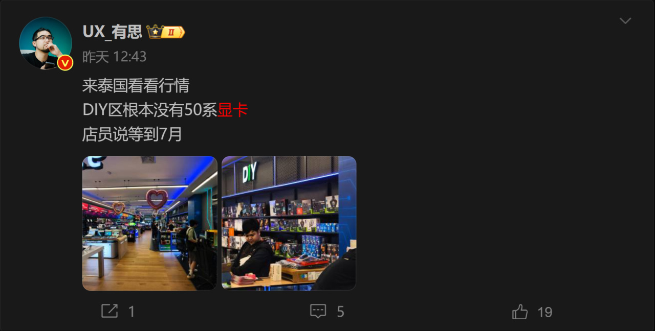 但是,虽然可以进行售后处理,现如今 50 系显卡依然面临缺货的情况。微博博主 @UX_有思表示泰国一家零售店说他们需要到 7 月才有 RTX 50 系显卡的货源。