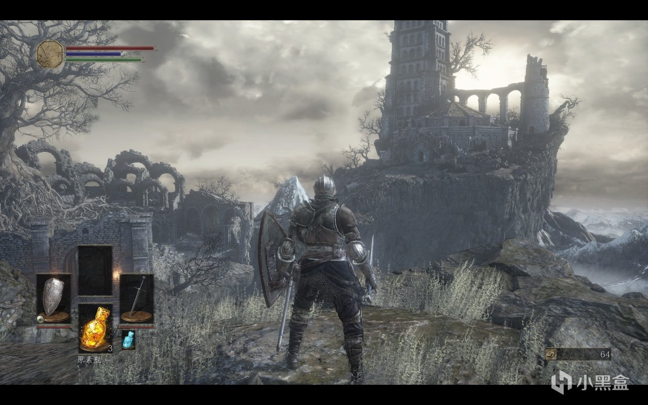 这是在击败冷冽谷的波尔多后,展现在玩家眼前的场景。玩家走出新手村,魂三恢弘的世界跃然在眼前,如果你是个一周目的新手,或许只能看到眼前的不死聚落,但一旦开始二周目,眼前的这副景象就会变得非常深刻,眼前的每一个建筑物,我们都到那里去过,近至不死聚落,远至古龙顶端,我能记住那里的每一条路。