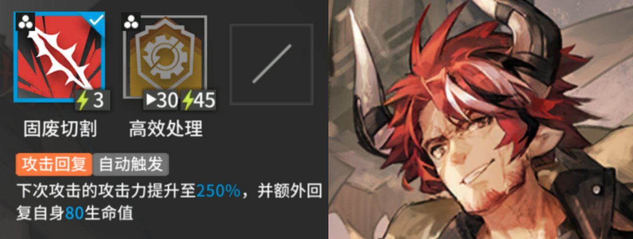 四星休謨斯的①技能也很有特色,7級3攻回技力,之後不再降低技力消耗,觸發時造成一次高倍率物傷並回復80血量,搭配x模特性對單時一次回覆140血量,單次傷害701×2.5≈1752