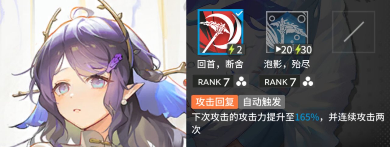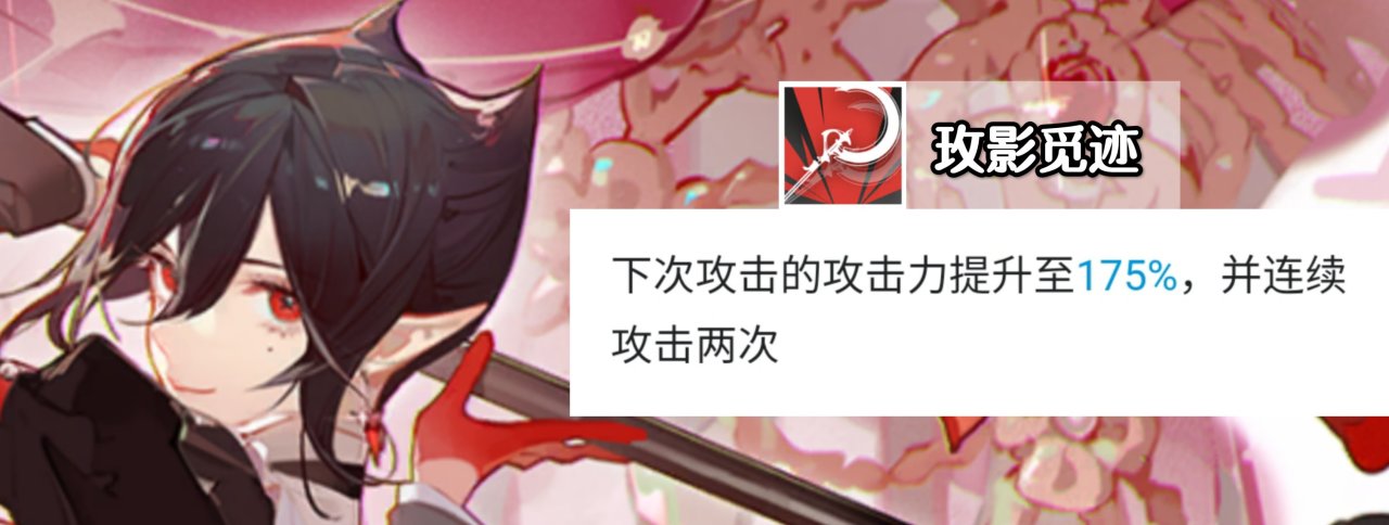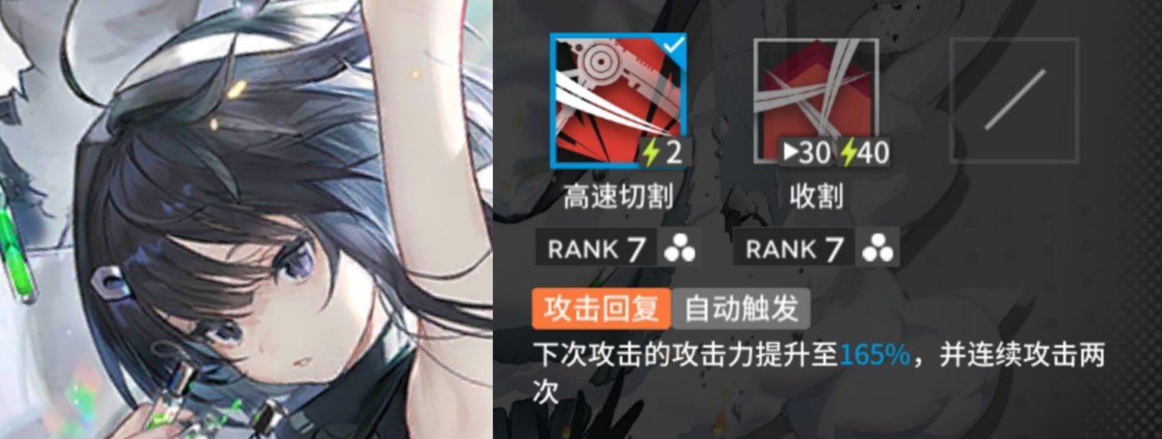 ①技能破甲線遠高於另外4個收割者的①技能,天賦和技能都有不低的固定穿甲,打一些高甲敵人時也不至於刮痧,概率二連擊觸發時提升技能總傷,也能夠額外回覆1技力加快啓動