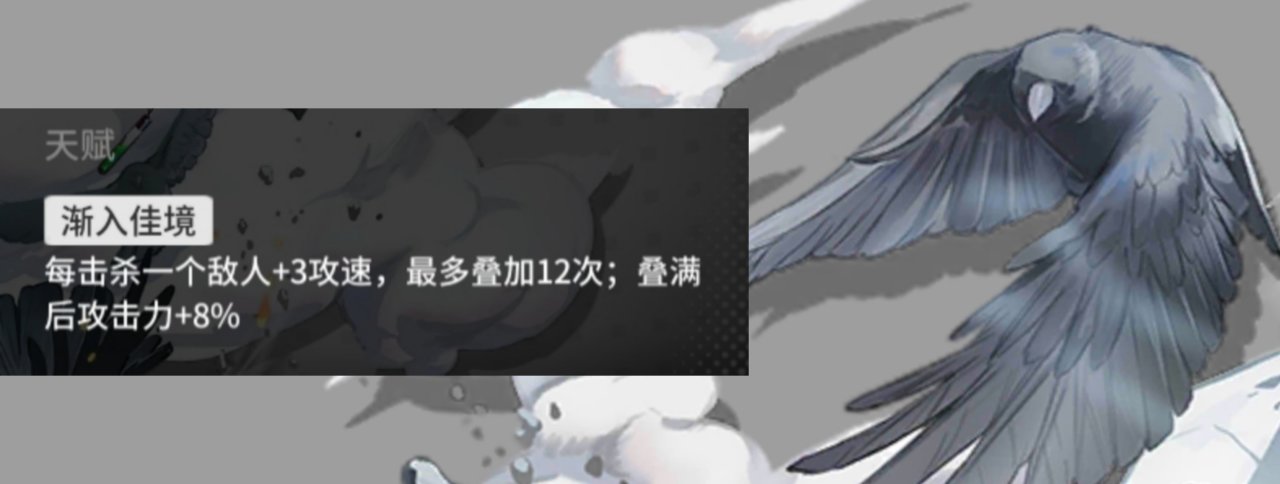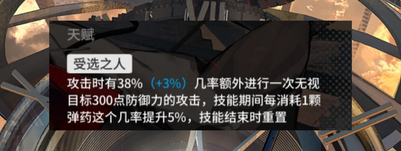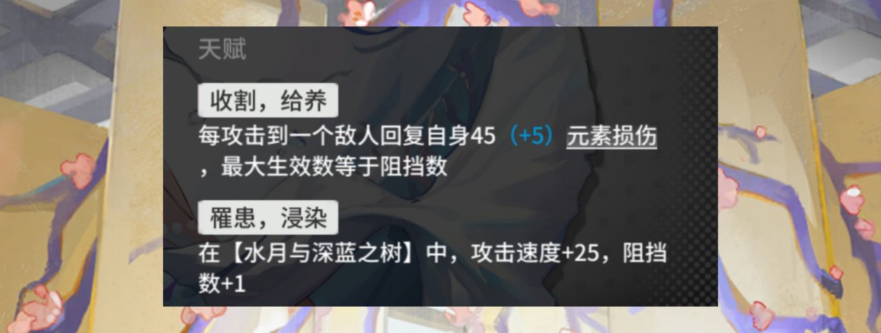 ①技能觸發時還有比特性更高的回血量,也有利於天賦觸發,溢出血量轉爲屏障,羽毛筆x模給天賦追加8%攻擊加成,休謨斯x模則是給天賦追加8%防禦,有(源於自身的)屏障時即可生效,在①技能掛機期間提升硬度,最大防禦463×1.08≈500