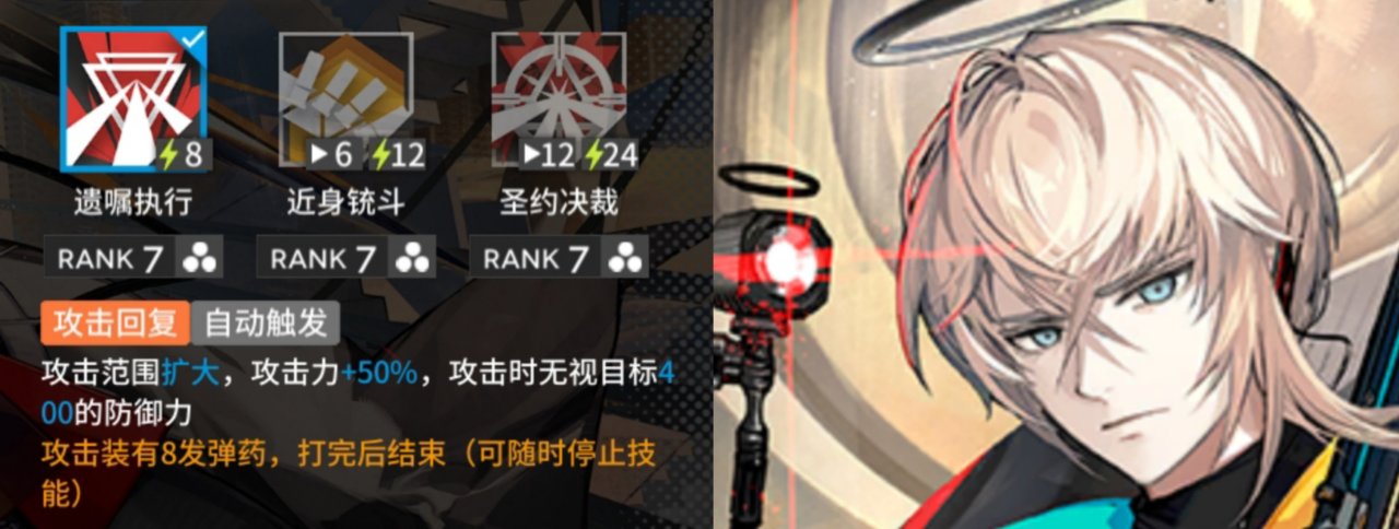 聖約送葬人的①技能就非常特殊了,8攻回技力的持續性彈藥技能,非強力擊類型的掛機技能,7級就是8技力,專精不降低技力消耗,具有三種效果:擴大範圍、加攻、穿甲