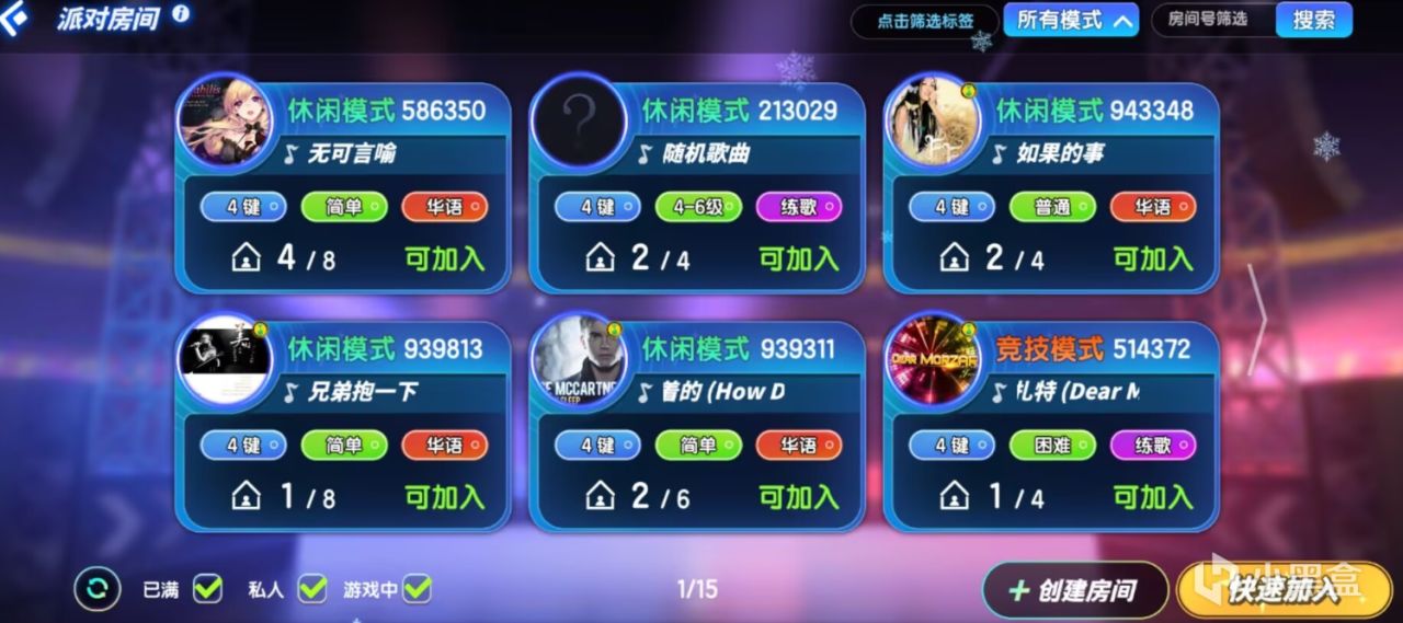 节奏大师:排外三选一pk,房间只能房主选歌(不能各自选择难度),选完一首选下一首。