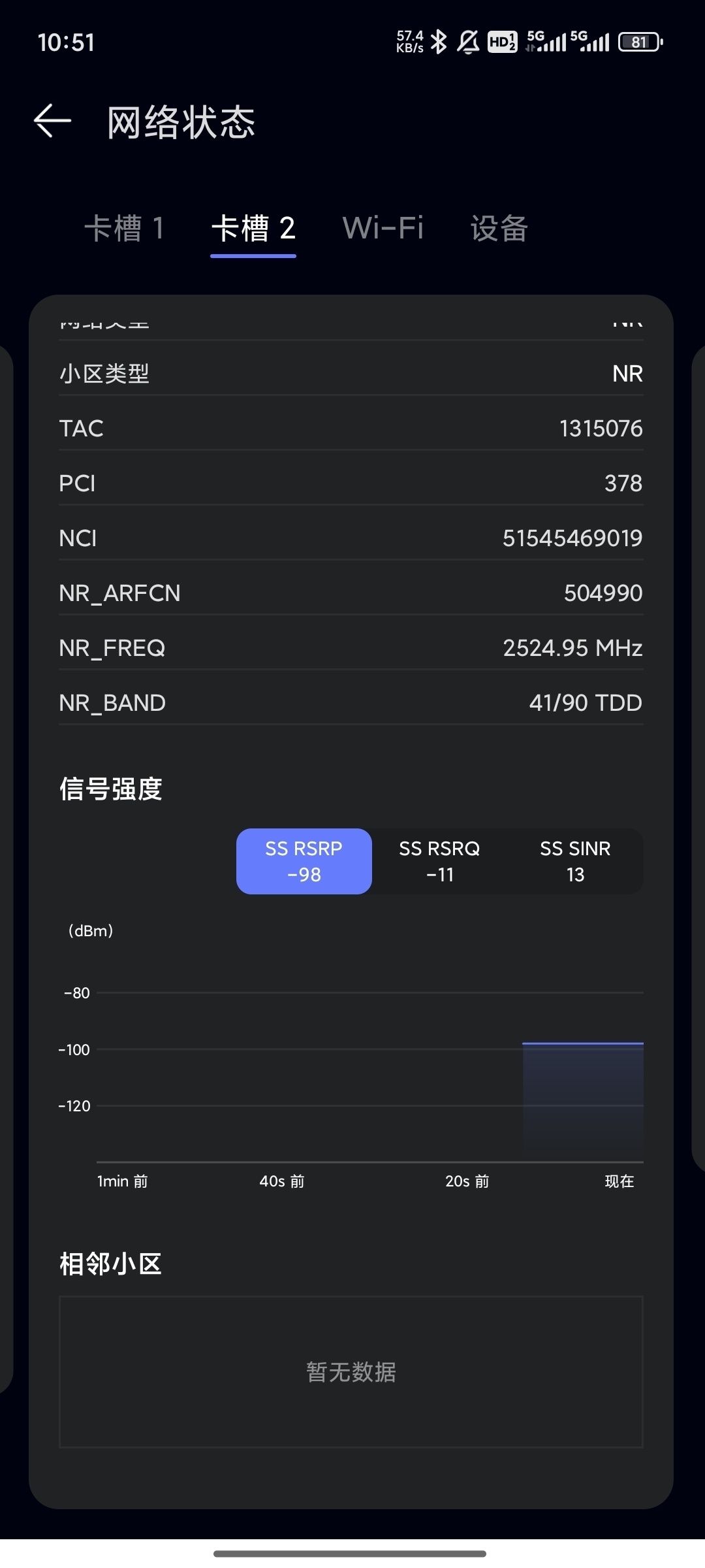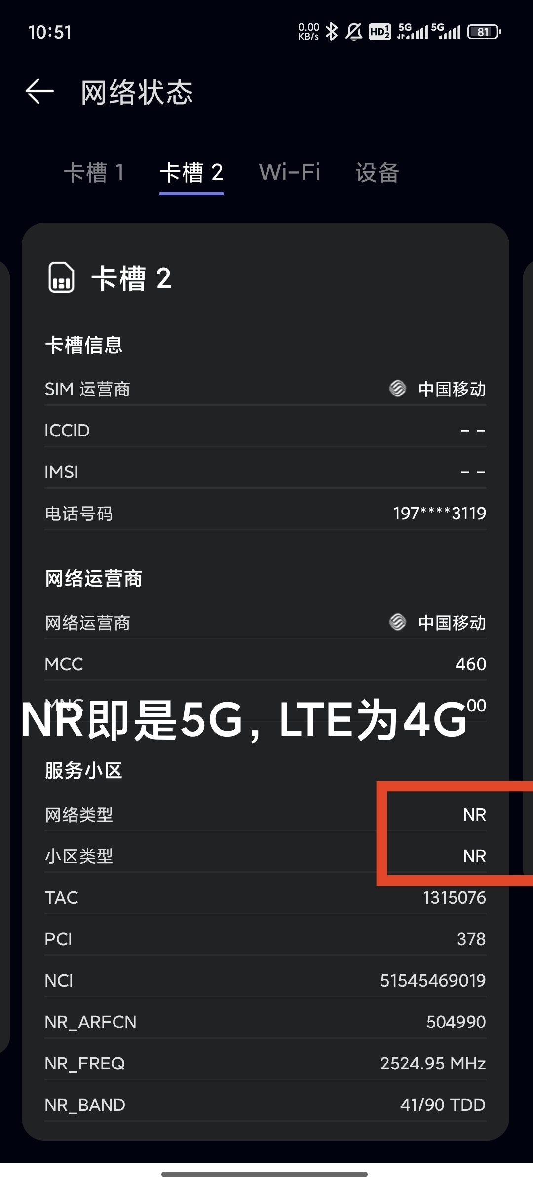 NR_BAND:連接頻段,N41會顯示成41/90,N78會顯示成77/78。