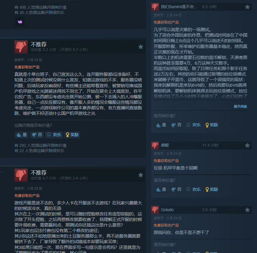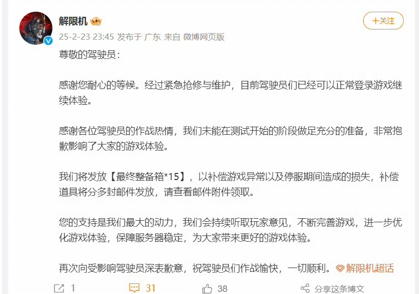 曾一度出現玩家無法登陸服務器的問題。對此遊戲在昨天(2月23日)晚上20:30關閉匹配模式,並於21:00至21:20進行停機維護更新