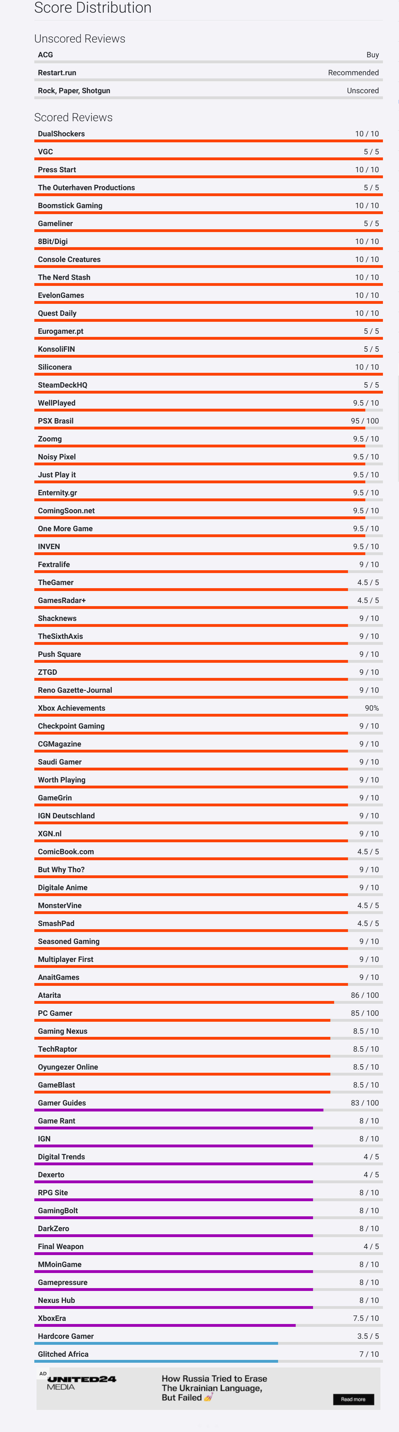 截至發稿前,Metacritic(PS5)收錄 43 家媒體,均分 89 分。