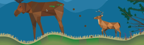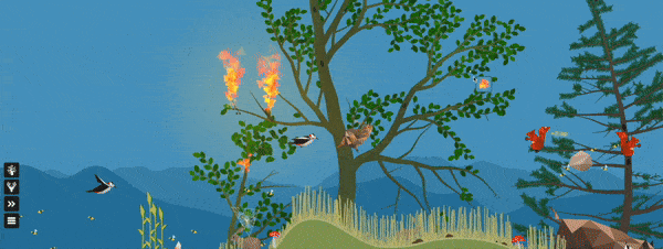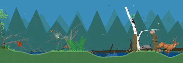点击动物会触发多种行为,并影响森林的生态系统:驼鹿会产生粪便,为土壤施肥;田鼠会啃食根系,伤害树木;狐狸则会捕猎其他动物。