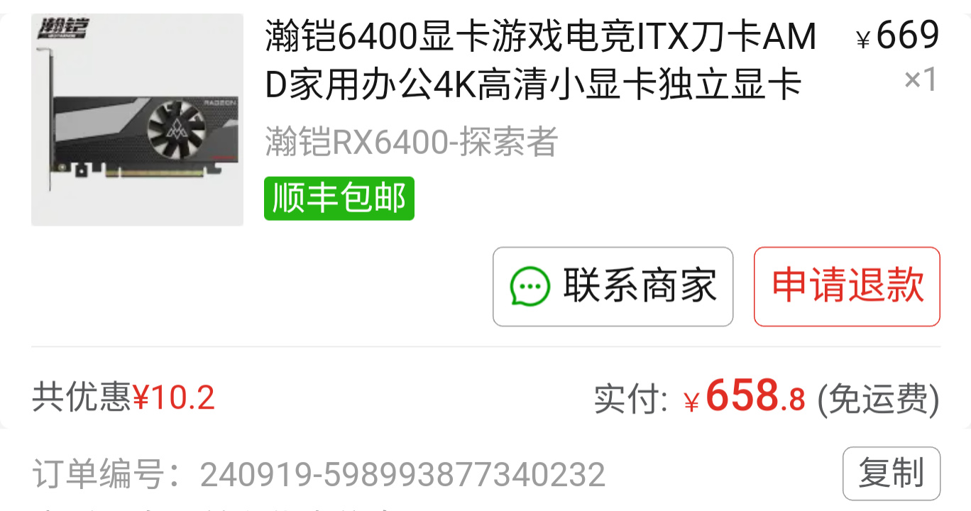 如果你的使用场景有多屏多负载需求,上一张rx6400确实是可以给你相对不错的体验,不占供电,半高刀卡,功耗很低,性能还可以