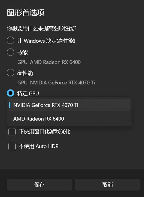 而在win11的加持下,可以单独调整每个软件使用的gpu,也就是我可以单独让浏览器跑在副卡上来观看直播和视频,从而不占用主卡资源