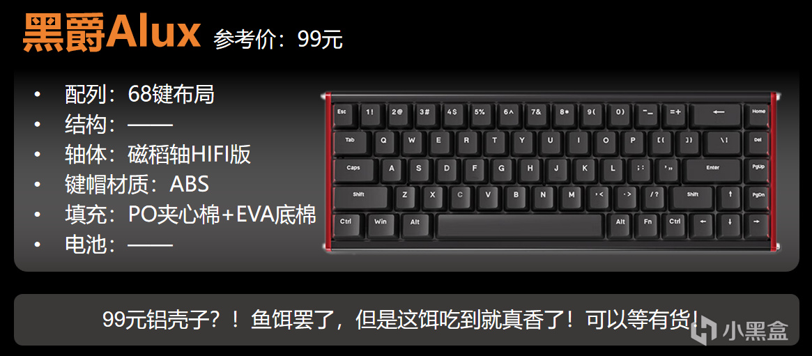 黑爵的Alux68,之前愣是做出99元鋁合金外殼的騷操作,性價比堪稱逆天。不過很明顯,這是一波吸引流量的操作,現在已處於沒貨狀態。但別擔心,後續隨着市場壓力變化,它自然會恢復供貨。懂的都懂。