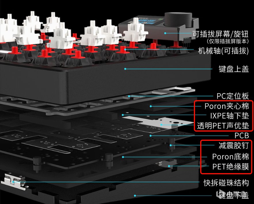 不僅有旋鈕和屏幕,雖然只是LOGO屏,但總比沒有好。而且軸體也有很多可選。雖然只是有線單模,但是這不是問題。甚至這鍵盤還有RGB燈效,IXPE軸下墊+EPDM夾心棉組的三明治結構做緩衝,現在你覺得有線單模是問題嗎?