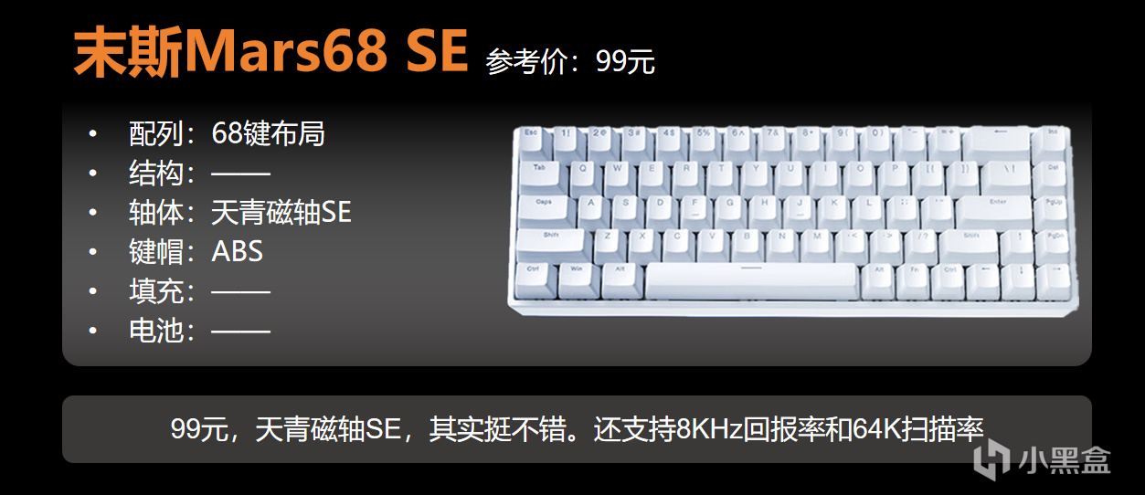 Mars68的SE版本99元,是有點噱頭的意思,沒有燈光用的是ABS鍵帽也沒有填充,但是天青磁軸SE即使是SE版本手感依然不錯。