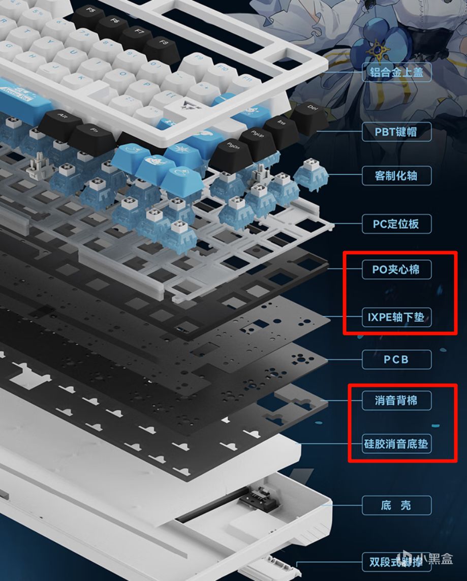 填充:Poron消音棉+IXPE軸下墊+PET墊+硅膠底墊+Poron底棉
