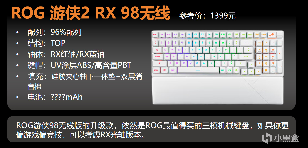 這個是之前ROG遊俠98無線版的升級款,三模連接+98配列+Omni雙設備連接+多功能三方向旋鈕+ROG PBT鍵帽(懂不懂一套249元鍵帽的含金量?)+自帶掌託這些通通保留,而且還更新搭載了ROG定製的RX光軸,線性的RX紅軸和段落的RX藍軸。手感都極其接近機械軸。