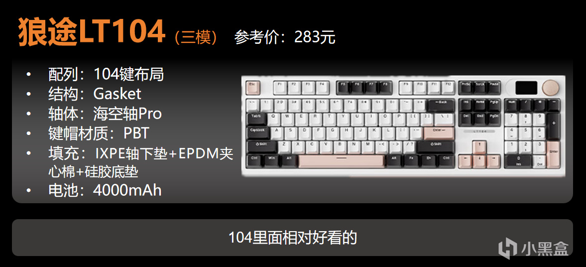 最近LT104還做了個三模版本,跟之前LT84三模版一樣,都是海空軸Pro,生態位還不錯,比高斯貴,但是屏幕更好,軸體更好,顏色也好看,很有多巴胺的感覺。唯一問題是電池只有4000mAh。