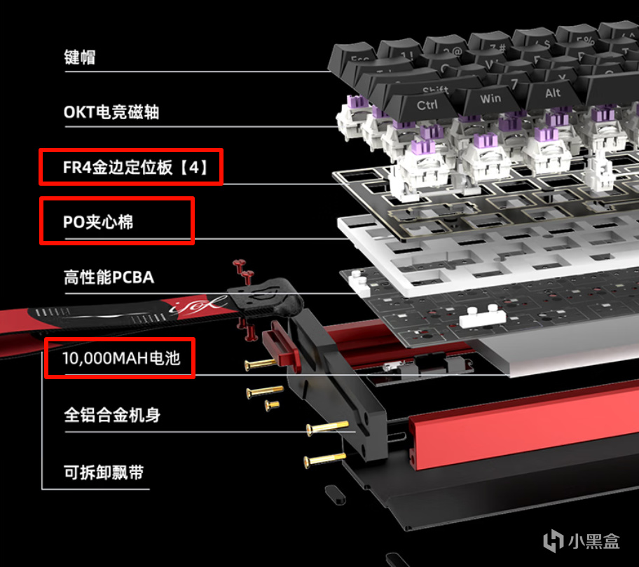 在鍵盤填充方面,這更鍵盤也捲到了第一梯隊。在磁軸鍵盤裏做到了5層填充,分別是poron夾心棉、IXPE軸下墊、PCB下層泡棉、PET絕緣墊以及底部硅膠填充。