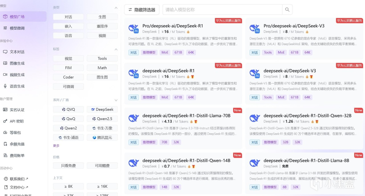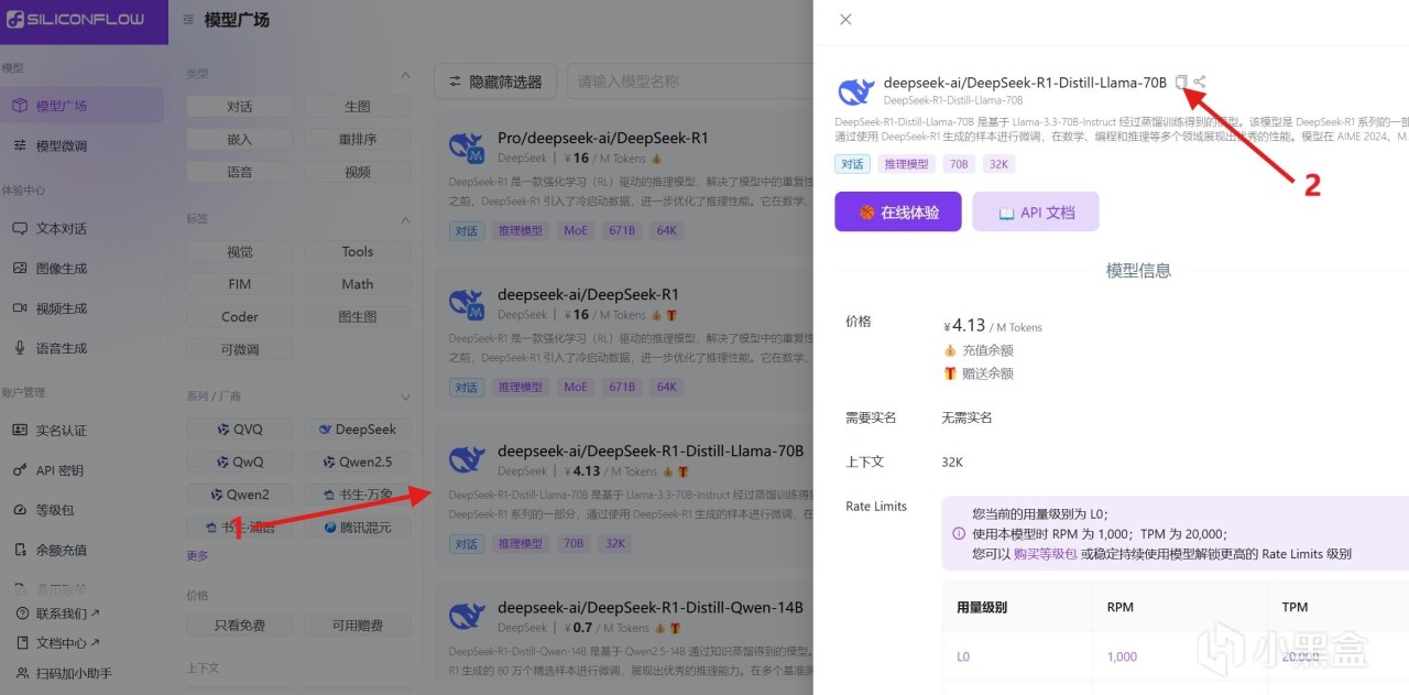 DeepSeek-R1-Distill-Llama-70B、DeepSeek-R1-Distill-Qwen-32B,如果充值了,还可以调用满血版DeepSeek-R1(购买等级包)。