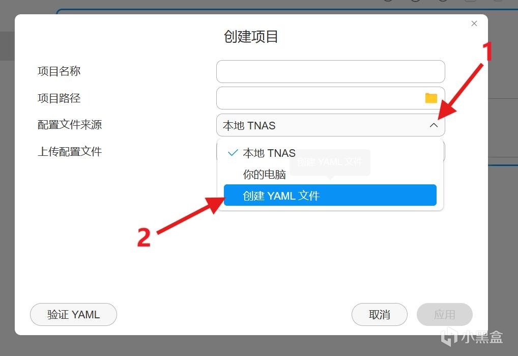在“创建项目”的“配置文件来源”中,点击右边符号,弹出对话框选中“创建YAML文件”。