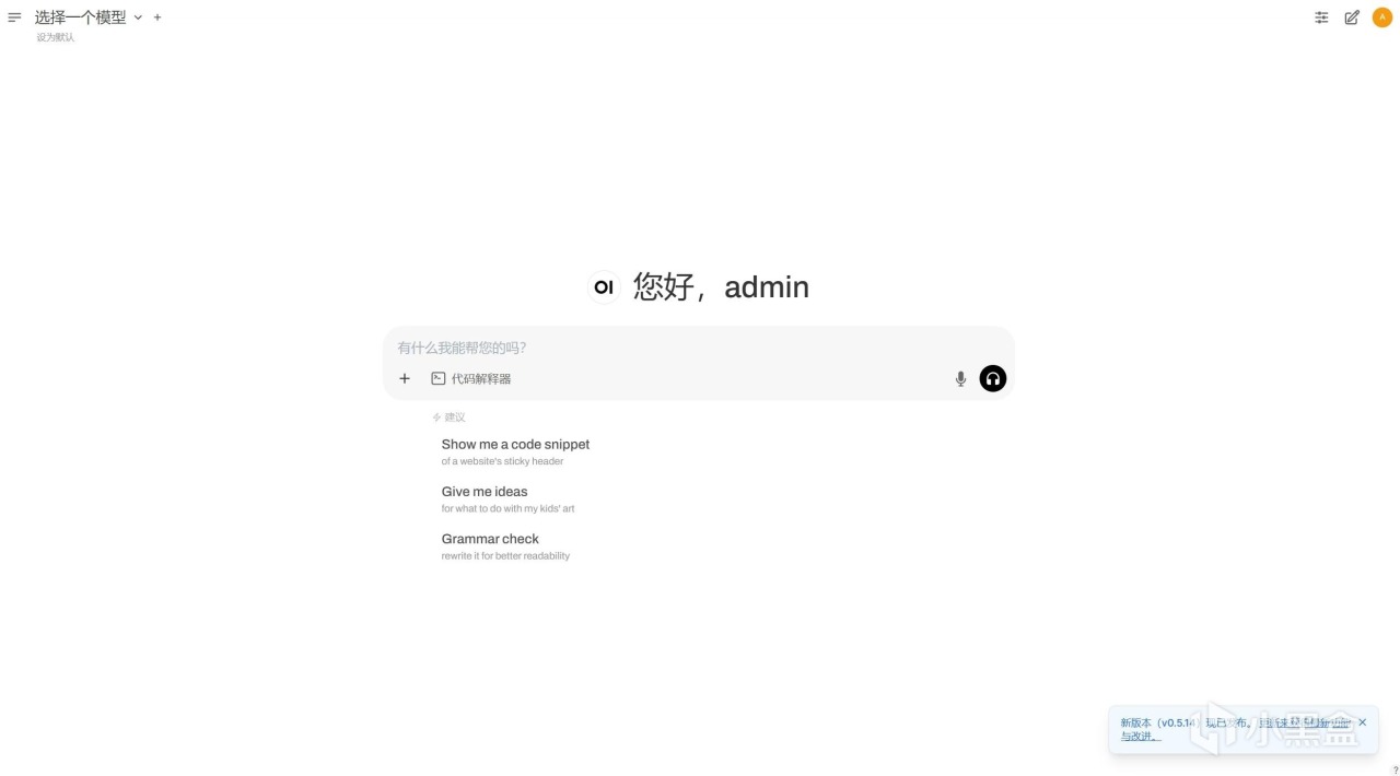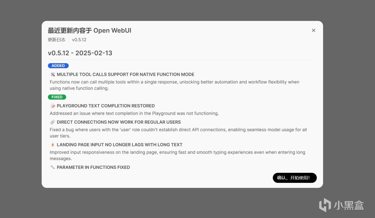 注册完毕后,有一个欢迎界面。Open WebUI更新还是比较勤快的,最新已经升级到0.5.14(截止至25年2月17日),我用的还是0.5.12。