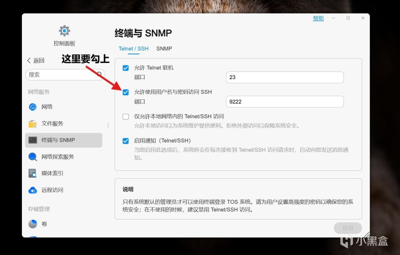 安装TOS的过程这里就不做细讲了。当安装完毕后,进入“控制面板”——“终端与SNMP”,如图所示,将“允许使用用户名与密码访问SSH端口”选中。日后可以使用时SSH(相当于命令行)访问NAS,降低我们的时间成本。
